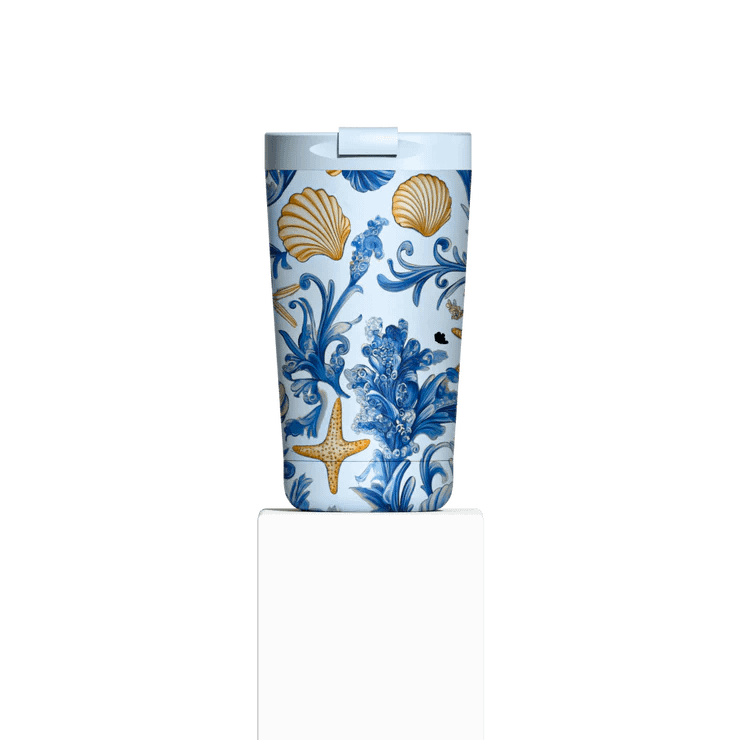 Ovaj luksuzni dizajn s dubokim plavim valovima i zlatnim školjkama donosi mediteransku atmosferu svakom trenutku uz kavu. Čuvajte svoja pića toplima ili hladnima satima uz ovu izdržljivu i ponovno upotrebljivu šalicu – savršenu za put ili u uredu.